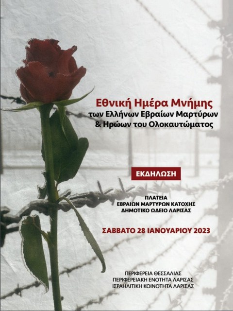 Η Περιφέρεια Θεσσαλίας, η Περιφερειακή Ενότητα Λάρισας και η Ισραηλιτική Κοινότητα Λάρισας τιμούν την Εθνική Ημέρα Μνήμης του Ολοκαυτώματος, το Σάββατο 28 Ιανουαρίου. Στις 6.30 μ.μ. θα τελεστεί επιμνημόσυνη δέηση και θα γίνει κατάθεση στεφάνων στην Πλατεία Εβραίων Μαρτύρων.