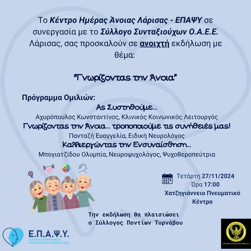 Το Κέντρο Ημέρας Άνοιας Λάρισας της ΕΠΑΨΥ, σε συνεργασία με τον Σύλλογο Συνταξιούχων ΟΑΕΕ Λάρισας, σας προσκαλεί σε ανοιχτή εκδήλωση με θέμα: «Γνωρίζοντας την Άνοια», την Τετάρτη 27 Νοεμβρίου 2024, στις 17:00, στο Χατζηγιάννειο Πνευματικό Κέντρο (Ρούσβελτ 57). Η είσοδος είναι ελεύθερη για το κοινό.