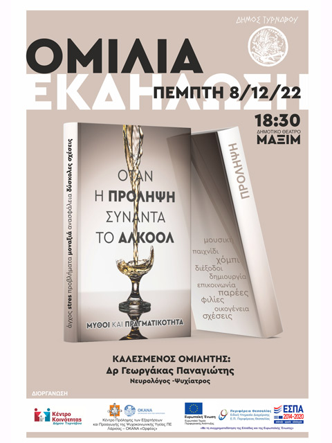 Το Κέντρο Κοινότητας του Δήμου Τυρνάβου σε συνεργασία με το Κέντρο Πρόληψης Π.Ε. Λάρισας – ΟΚΑΝΑ «ΟΡΦΕΑΣ» διοργανώνουν εκδήλωση με θέμα: «Όταν η πρόληψη συναντά το Αλκοόλ: Μύθοι και Πραγματικότητα», που θα πραγματοποιηθεί την Πέμπτη 8 Δεκεμβρίου 2022 και ώρα 18:30΄ στο Δημοτικό Θέατρο Τυρνάβου.