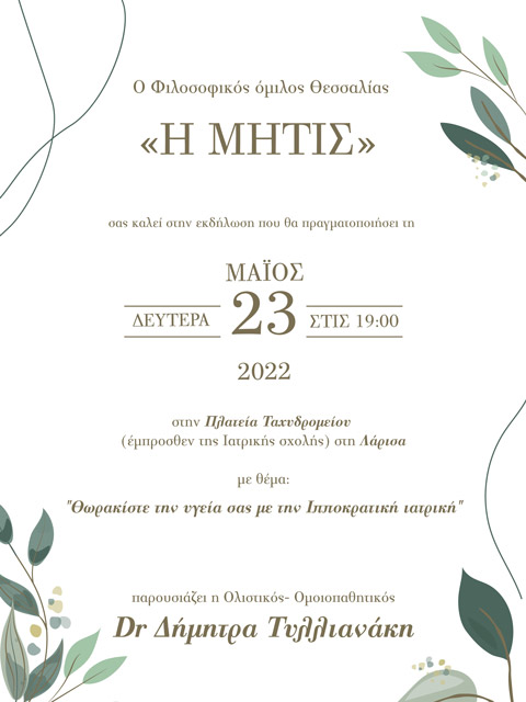 Ο Φιλοσοφικός Όμιλος Θεσσαλίας “Η Μήτις” σας προσκαλεί τη Δευτέρα 23 Μαΐου 2022 ώρα 7μ.μ. στην πλατεία Ταχυδρομείου της Λάρισας, στην εκδήλωση με θέμα “Θωρακίστε την υγεία σας με την Ιπποκρατική Ιατρική”, παρουσιάζει η ολιστική – ομοιοπαθητικός Dr Δήμητρα Τυλλιανάκη.