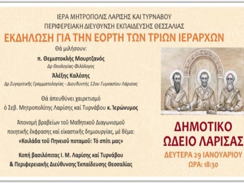 Η Ιερά Μητρόπολη Λαρίσης και Τυρνάβου, με την ευκαιρία της Εορτής των Τριών Ιεραρχών, Πατέρων και Διδασκάλων της Εκκλησίας μας και προστατών της Ελληνορθοδόξου Παιδείας και Παράδοσης, διοργανώνει εκδήλωση στο Δημοτικό Ωδείο Λάρισας την Δευτέρα 29 Ιανουαρίου 2024 και ώρα 6:30 μ.μ., προκειμένου: