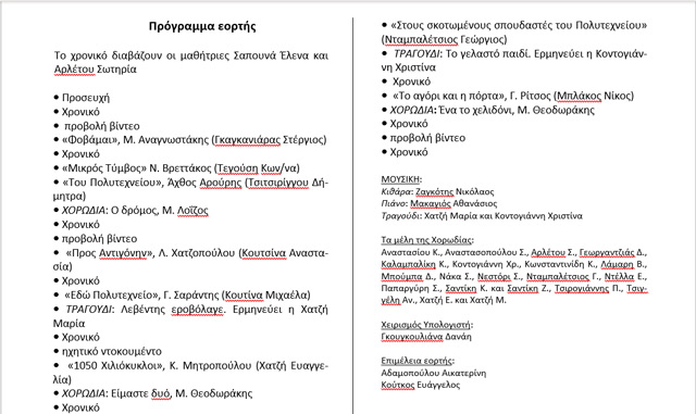 Επίσης ευχαριστούμε τους μαθητές όλων των τάξεων που παρακολούθησαν το αφιέρωμα μνήμης με ενδιαφέρον και σεβασμό και τον απόφοιτο του σχολείου μας, Ιωάννη Χατζή για την πολύτιμη βοήθεια που προσέφερε στην χορωδία.