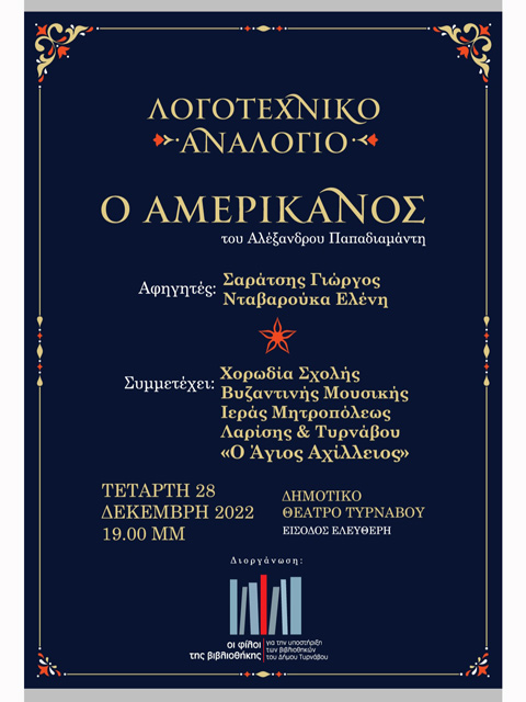Την Τετάρτη 28 Δεκεμβρίου 2022 και ώρα 19.00 μ.μ., θα παρουσιαστεί στο Δημοτικό Θέατρο Τυρνάβου (ΜΑΞΙΜ) εκδήλωση υπό τη μορφή Λογοτεχνικού Αναλογίου.