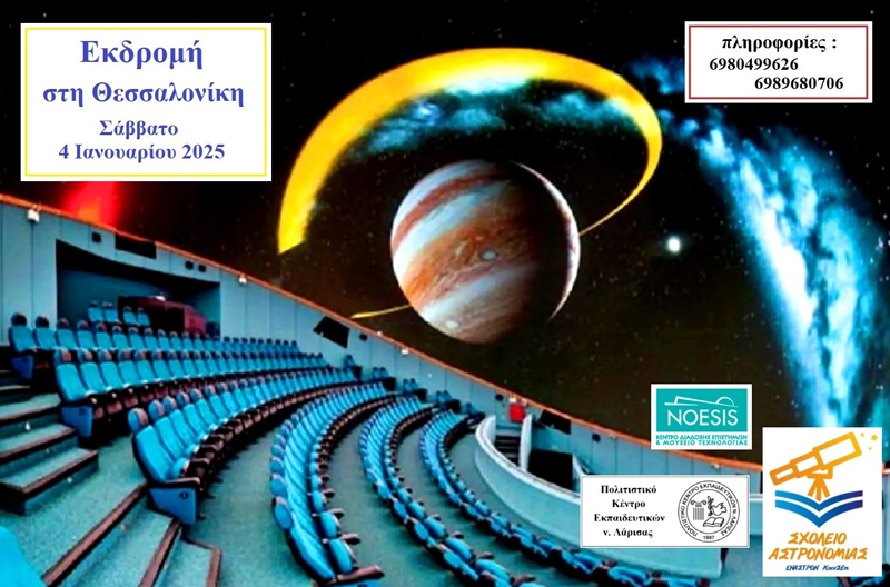 Το Σχολείο Αστρονομίας – ΚοινΣΕπ «Έναστρον», σε συνεργασία με το ΠΟΚΕΛ – Πολιτιστικό Κέντρο Εκπαιδευτικών ν. Λάρισας, διοργανώνει εκδρομή στη Θεσσαλονίκη, στο Κέντρο Διάδοσης Επιστημών και Μουσείο Τεχνολογίας «ΝΟΗΣΙΣ», το Σάββατο, 4 Ιανουαρίου 2025. Δικαίωμα συμμετοχής στην εκδρομή έχουν τα μέλη και οι φίλοι του Σχολείου Αστρονομίας και του ΠΟΚΕΛ, αλλά προτεραιότητα έχουν οι μαθητές του σχολείου και οι γονείς τους.