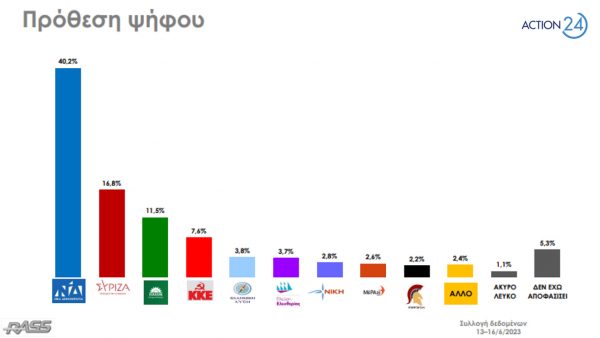 Ειδικότερα, σύμφωνα με δημοσκόπηση της RASS, για το ACTION 24, στην πρόθεση ψήφου, η Νέα Δημοκρατία συγκεντρώνει ποσοστό 40,2%, ενώ ο ΣΥΡΙΖΑ φαίνεται να βρίσκεται κάτω από το 20% και συγκεκριμένα στο 16,8%. Ακολουθεί το ΠΑΣΟΚ με 11,5%, το ΚΚΕ με 7,6%, η Ελληνική Λύση με 3,8% και η Πλεύση Ελευθερίας με 3,7%, ενώ εκτός Βουλής μένουν, σύμφωνα με τη δημοσκόπηση, Νίκη, ΜέΡΑ25 και Σπαρτιάτες.