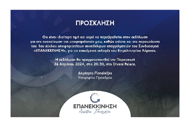 Την Παρασκευή 26 Απριλίου 2024 και ώρα 20:30 στο Divani Palace θα πραγματοποιηθεί η εκδήλωση ανακοίνωσης της υποψηφιότητας του κ. Δημήτρη Παπαλέξη, καθώς επίσης και της παρουσίασης του 1ου κύκλου υποψηφιοτήτων συναδέλφων επαγγελματιών του Συνδυασμού «ΕΠΑΝΕΚΚΙΝΗΣΗ», για τις επικείμενες εκλογές του Επιμελητηρίου Λάρισας.