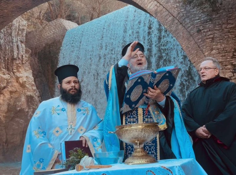 Αρχικά, κατευθύνθηκε στη Νέα Γέφυρα, που συνδέει τις όχθες του Πορταϊκού Ποταμού, όπου τέλεσε τον αγιασμό και την κατάδυση του Τιμίου Σταυρού, σύμφωνα με την παράδοση των Θεοφανείων.