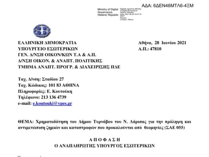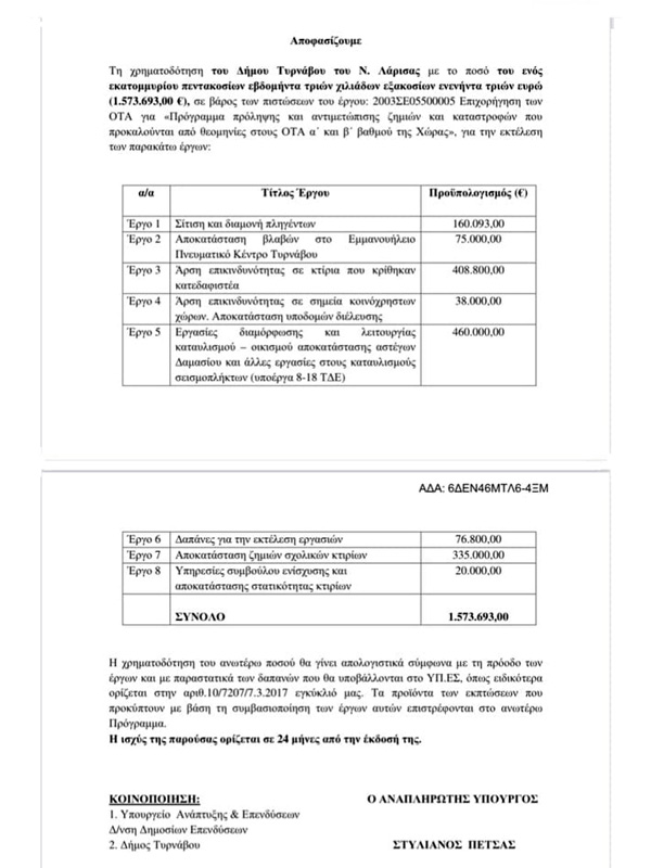 Έκτακτο: Απόφαση Πέτσα: 1.573.693,00 € στο Δήμο Τυρνάβου
