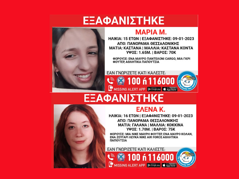 Δύο κορίτσια 15 και 16 χρονών εξαφανίστηκαν από τη Θεσσαλονίκη σύμφωνα με το Χαμόγελο του Παιδιού. Πρόκειται για την 15χρονη Μαρία και την 16χρονη Έλενα που φιλοξενούνταν και οι δύο σε δομή παιδικής προστασίας στη Θεσσαλονίκη.
