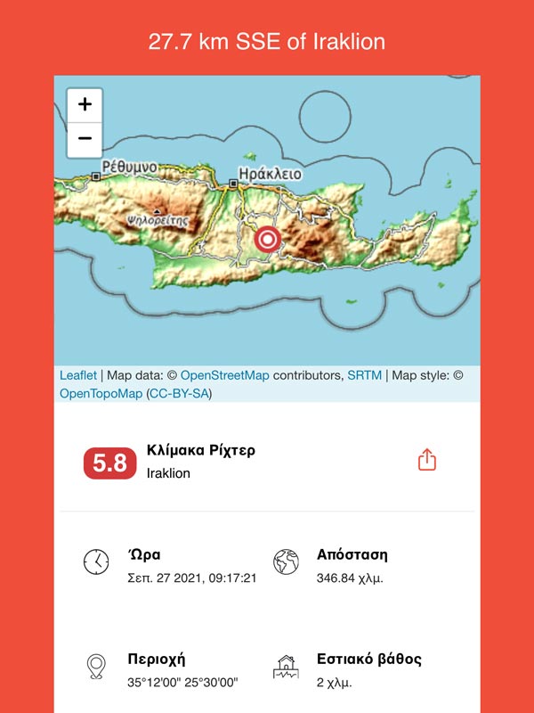 Μεγάλος σεισμός στο Ηράκλειο Κρήτης 5,8 βαθμών της κλίμακας ρίχτερ και αρκετούς μετασεισμούς σήμερα 27 Σεπτεμβρίου στις 09:17.21 το πρωί με ένα ακόμα σεισμό της ίδιας κλίμακας και αρκετούς μετασεισμούς στην συνέχεια με 4,5 στα Μάταλα