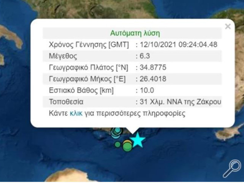 Σεισμός μεγέθους 6,3 βαθμών της κλίμακας Ρίχτερ σημειώθηκε νότια της Κρήτης σύμφωνα με προκαταρκτική εκτίμηση του Γεωδυναμικού Ινστιτούτου του Εθνικού Αστεροσκοπείου Αθηνών.