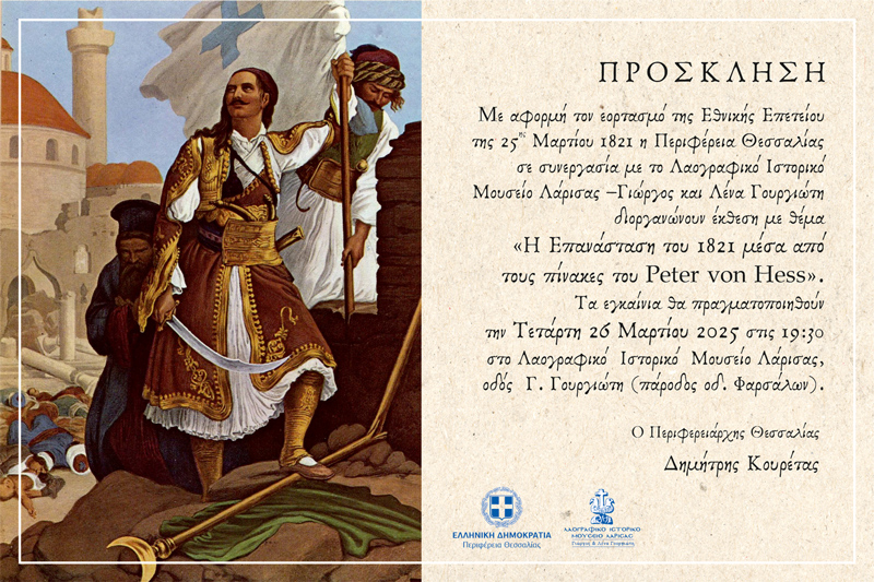 Με αφορμή τον εορτασμό της Εθνικής Επετείου της 25ης Μαρτίου 1821 η Περιφέρεια Θεσσαλίας σε συνεργασία με το Λαογραφικό Ιστορικό Μουσείο Λάρισας –Γιώργος και Λένα Γουργιώτη διοργανώνουν έκθεση με θέμα «Η Επανάσταση του 1821 μέσα από τους πίνακες του Peter von Hess».