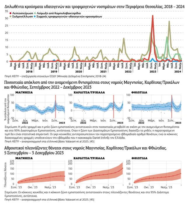 Μόνο μέρος της πλεονάζουσας ολικής θνησιμότητας που καταγράφηκε στη Θεσσαλία και τη Στερεά Ελλάδα, σύμφωνα με την επιστημονική ομάδα του ΚΕΠΥ, μπορεί να αποδοθεί στους δηλωθέντες άμεσους θανάτους της πλημμύρας ή τους δηλωθέντες θανάτους τους σχετιζόμενους με τις εξάρσεις λοιμωδών και υδατογενών/τροφιμογενών νοσημάτων που παρατηρήθηκαν στις πληγείσες περιοχές μετά την πλημμύρα. Κι ας μην είναι ακόμα διαθέσιμα τα στοιχεία σχετικά με τις αιτίες θανάτων για τη χρονική περίοδο 2023-24.