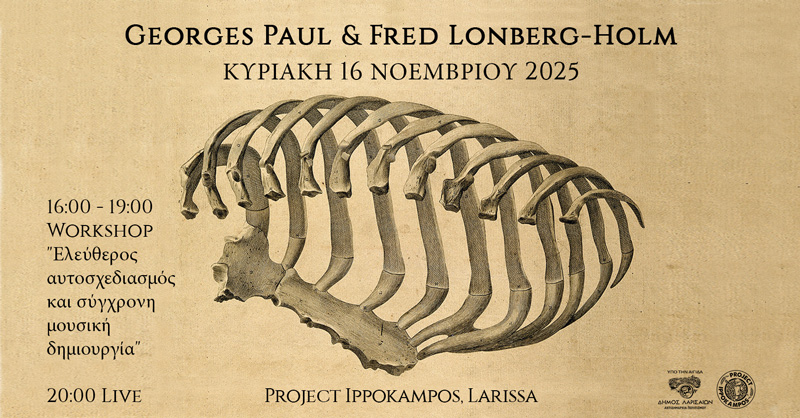 Mία ξεχωριστή Κυριακή αφιερωμένη στον ελεύθερο αυτοσχεδιασμό και τη σύγχρονη μουσική δημιουργία, με τη συμμετοχή δύο κορυφαίων καλλιτεχνών της διεθνούς πειραματικής σκηνής, του σαξοφωνίστα Georges Paul και του τσελίστα Fred Lonberg-Holm, παρουσιάζουν η Αντιδημαρχία Πολιτισμού του Δήμου Λαρισαίων και το Project ΙππόΚαμπος, την Κυριακή 16 Νοεμβρίου, στο Εργαστήριο του Project ΙππόΚαμπος Ηπείρου και Τζαβέλλα.