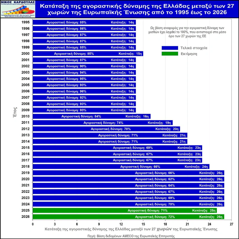 Τις τελευταίες ημέρες κυκλοφορεί στα μέσα κοινωνικής δικτύωσης και σε ορισμένες ιστοσελίδες ένα γράφημα στα Ελληνικά, που υποτίθεται ότι προέρχεται από τη βάση δεδομένων Ameco της Ευρωπαϊκής Επιτροπής, και το οποίο εμφανίζει την Ελλάδα τελευταία στην ΕΕ το 2025 ως προς την αγοραστική δύναμη.
