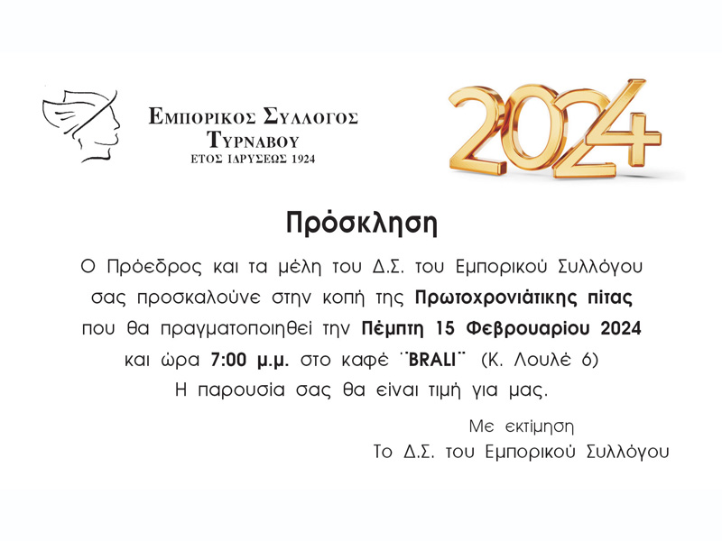 Ο πρόεδρος και τα μέλη του Δ.Σ του εμπορικού Συλλόγου σας προσκαλούνε στην κοπή της Πρωτοχρονιάτικης πίτας που θα πραγματοποιηθεί την Πέμπτη 15 Φεβρουαρίου 2024 και ώρα 7.00 μ.μ στο καφέ BRALI (Κ. Λουλε 6).