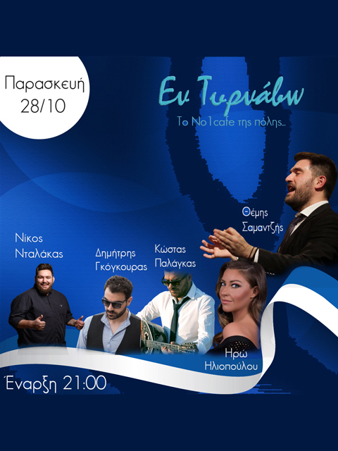 Η διασκέδαση συνεχίζεται σε non stop ρυθμούς στο Εν Τυρνάβω και ανήμερα της εθνικής μας επετείου, γιατί εδώ είναι η κορυφαία επιλογή… Την Παρασκευή 28η Οκτωβρίου 2022 από τις 9:00 μ.μ οι υπέροχοι Νταλάκας, Σαματζής, Θεοχαρίδου, Γκόγκουρας, Παλάγκας με τις μουσικές τους θα κάνουν ένα εντυπωσιακά μεγάλο πάρτι από νωρίς.
