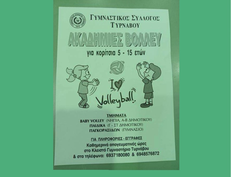 ΕΝΑΡΞΗ ΑΚΑΔΗΜΙΩΝ VOLLEY. ΤΡΙΤΗ 8 ΣΕΠΤΕΜΒΡΙΟΥ 4-6 ΣΤΟ ΚΛΕΙΣΤΟ ΓΥΜΝΑΣΤΗΡΙΟ ΤΥΡΝΑΒΟΥ.