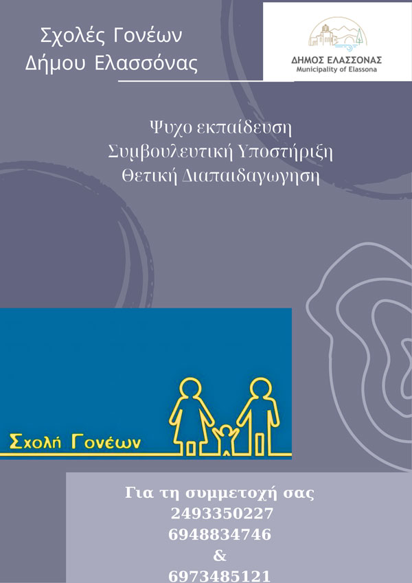 Η Αντιδημαρχία Σχολικών Δομών, Βιβλιοθηκών, Παιδικών Χαρών & Αθλητικών Εγκαταστάσεων του Δήμου Ελασσόνας ανακοινώνει την έναρξη ενός κύκλου συναντήσεων της «Σχολής Γονέων», με σκοπό την υποστήριξη, την ενδυνάμωση του ρόλου των γονέων μέσα στην οικογένεια και την καλλιέργεια ενός θετικού και υποστηρικτικού περιβάλλοντος για την ολόπλευρη ανάπτυξη των παιδιών.