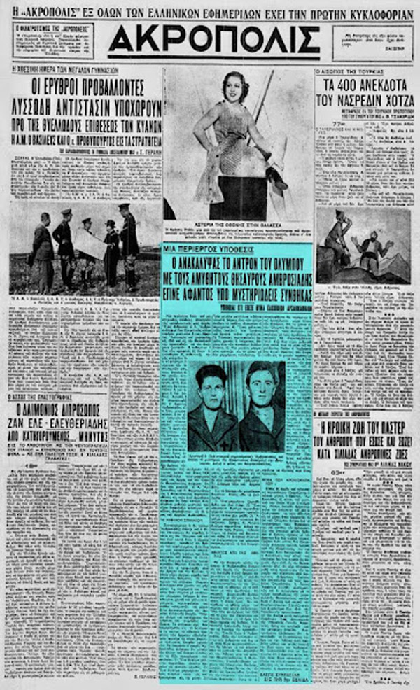 Η αλλόκοτη αυτή ιστορία ξεκίνησε στα τέλη του 1936, όταν αλλεπάλληλα τηλεγραφήματα προς τις Αρχές και τον Τύπο ανέφεραν ότι δύο νέοι χωρικοί, ο Α. Αμβροσιάδης και ο Ν. Φουρτουνόπουλος ή Φωτεινόπουλος, παρουσιάστηκαν στους αρμόδιους της Θεσσαλονίκης και τους εξομολογήθηκαν πως ήταν κάτοχοι ενός αληθινά μυθικού μυστικού, που ελλόχευε στο ‘Όρος των Θεών, στον Όλυμπο.