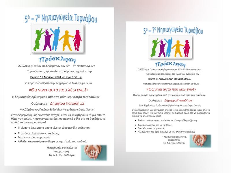 Ο Σύλλογος Γονέων και Κηδεμόνων των 5ου – 7ου Νηπιαγωγείων Τυρνάβου σας προσκαλεί στο χώρο του σχολείου την Πέμπτη 11 Απριλίου 2024 και ώρα 6.30 μ.μ. να παρακολουθήσετε την ενημερωτική διάλεξη με θέμα: «Θα γίνει αυτό που λέω εγώ!» Η δημιουργία ορίων μέσα από την καθημερινότητα των παιδιών.