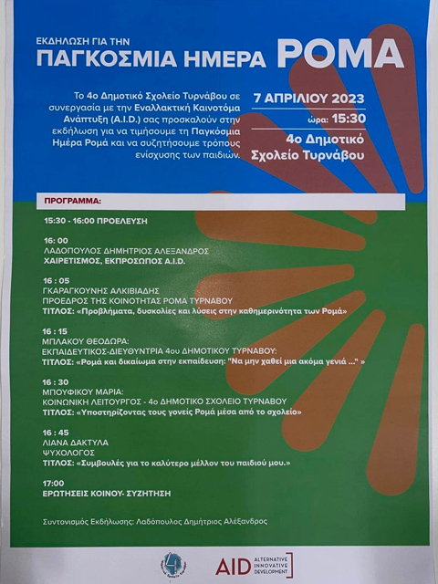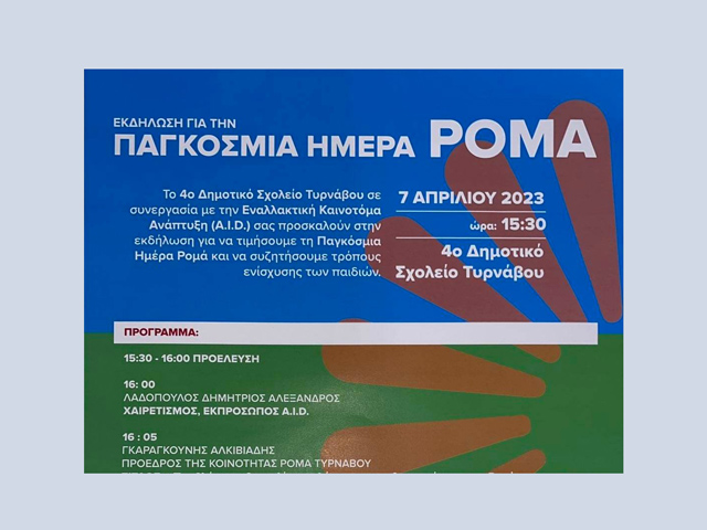 Το 4ο Δημοτικό Σχολείο Τυρνάβου σε συνεργασία με την Εναλλακτική Καινοτόμα Ανάπτυξη (A.I.D.) διοργανώνουν ενημερωτική εκδήλωση με αφορμή την Παγκόσμια Ημέρα Ρομά την Παρασκευή 7 Απριλίου 2023, 4.00 μ.μ.