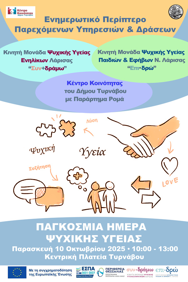 Με αφορμή την Παγκόσμια Ημέρα Ψυχικής Υγείας (10 Οκτωβρίου) το Κέντρο Κοινότητας του Δήμου Τυρνάβου και το Κέντρο Κοινότητας με παράρτημα ΡΟΜΑ σε συνεργασία με την Κινητή Μονάδα Ψυχικής Υγείας Ενηλίκων Λάρισας ‘’Συν + δράμω’’ και την Κινητή Μονάδα Ψυχικής Υγείας Παιδιών και Εφήβων ‘’Επι·δρώ’’ του νομού Λάρισας διοργανώνουν ενημερωτικό περίπτερο στην Κεντρική Πλατεία του Τυρνάβου.