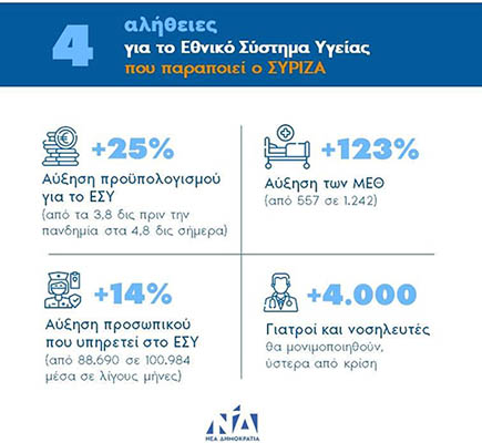 Στην ενίσχυση του Εθνικού Συστήματος Υγείας για την αντιμετώπιση της πανδημίας με 1 δις ευρώ, 12 χιλιάδες προσλήψεις (οι 4 χιλ μόνιμες) και υπερδιπλασιασμό των κλινών ΜΕΘ, αναφέρεται με σημερινή της ανακοίνωση η ΔΗΜΤΟ Ν.Δ. Τυρνάβου. Η ανακοίνωση έχει ως εξής: «Αυτές τις ώρες της μεγάλης μάχης απέναντι σε μια πρωτοφανή και παγκόσμια πανδημία, η Ελλάδα δίνει τη μάχη με όλες της τις δυνάμεις. Με αύξηση των δαπανών για το Εθνικό Σύστημα Υγείας κατά 1 δις ευρω. Με υπερδιπλασιασμό των κλινών ΜΕΘ από μόλις 567 που ήταν, σε 1.243 μέχρι σήμερα. Με περισσότερες από από 12 χιλιάδες προσλήψεις σε υγειονομικό προσωπικό, εκ των οποίων οι 4 χιλιάδες γιατροί και νοσηλευτές θα παραμείνουν μόνιμα στο ΕΣΥ.