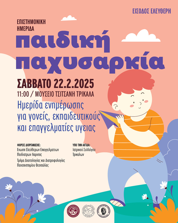 Η Ένωση Ελευθερoεπαγγελματιών Παιδιάτρων Λάρισας, σε συνεργασία με το Τμήμα Διαιτολογίας και Διατροφολογίας του Πανεπιστημίου Θεσσαλίας, διοργανώνει ημερίδα ενημέρωσης για τους γονείς, τους εκπαιδευτικούς και τους επαγγελματίες υγείας με θέμα την παιδική παχυσαρκία.