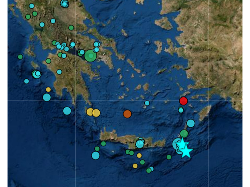 Επίσης σήμερα στην Κρήτη στα 46 Χλμ. Νότια της Κάσου στις 15:15 είχαμε σεισμό 5.2 βαθμών της κλίμακας ρίχτερ με εστιακό βάθος τα 9 χλμ. Ακολούθησαν πολλοί μετασεισμοί στην περιοχή. Στις 18:59 των 5.4 βαθμών 21 Χλμ. της Κάσου με εστιακό βάθος 6,3 χλμ.