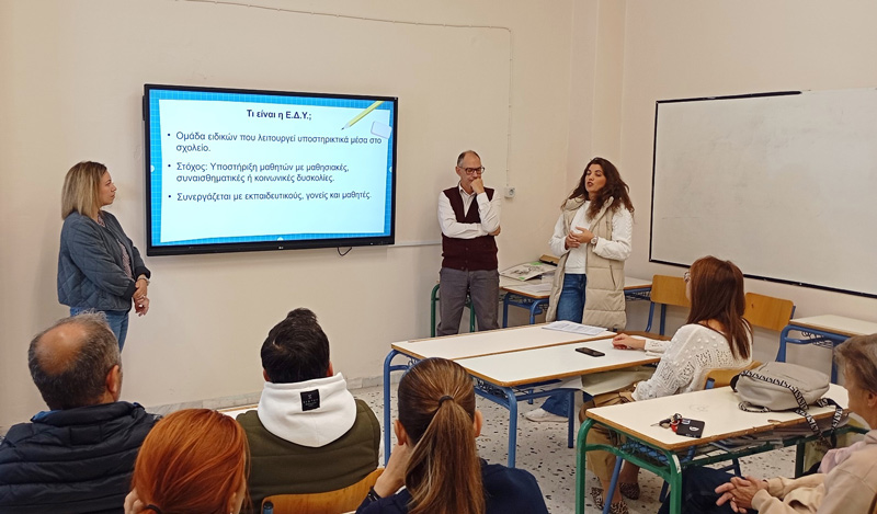 Η ψυχολόγος Τασιοπούλου Χριστίνα και η κοινωνική λειτουργός Βασιλείου Μαρία, ανέλυσαν τα καθήκοντα και τον τρόπο λειτουργίας της Ε.Δ.Υ., της οποίας αποτελούν μέλη. Επίσης, προβλήθηκε υλικό από τις περσινές δράσεις, τις εκπαιδευτικές επισκέψεις στο πλαίσιο των Σχολικών Εκπαιδευτικών Προγραμμάτων, τις εκδηλώσεις – γιορτές του σχολείου και τη θεατρική ομάδα, από τον υποδιευθυντή Σακατζή Δημήτριο.