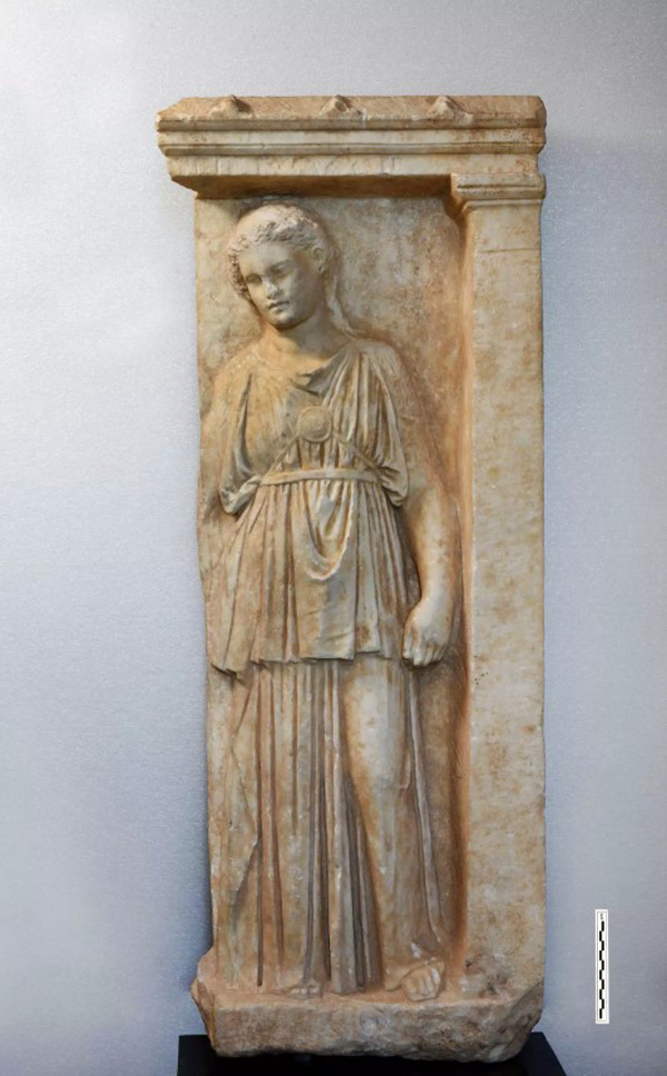 2. Τμήμα αττικού επιτύμβιου ναΐσκου από πεντελικό μάρμαρο, ύψους 0,95μ. και πλάτους 0,42μ. με ανάγλυφη παράσταση. Στο επιστύλιο σώζονται γράμματα νεότερης επιγραφής, που οφείλονται στην επαναχρησιμοποίηση του μνημείου σε μεταγενέστερη της κατασκευής του εποχή. Εικονίζεται νεαρό κορίτσι που παριστάνεται όρθιο, κατενώπιον με την κεφαλή να κλίνει ελαφρώς στα δεξιά. Φορεί χιτώνα με μανίκια και αττικό πέπλο ζωσμένο κάτω από το στήθος. Το ένδυμα συγκρατούν μασχαλιστήρες που διασταυρώνονται χιαστί μπροστά στο στήθος και στο μέσο ενώνονται με κυκλικό μετάλλιο. Χρονολογείται γύρω στα 330-320 π.Χ.