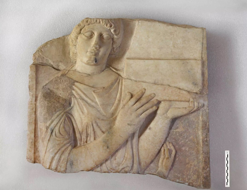 1. Τμήμα μαρμάρινης επιτύμβιας στήλης, ύψους 0,55μ. και πλάτους 0,60μ. Εικονίζεται σε επίπεδο ανάγλυφο μετωπική γυναικεία μορφή, η οποία κρατά και με τα δύο της χέρια κοσμηματοθήκη με ανοιχτό κάλυμμα. Χαμηλότερα στην παράσταση σώζεται το δεξί χέρι μικρότερης σε κλίμακα μορφής, αναμφίβολα παιδικής. Πρόκειται για έργο επαρχιακού εργαστηρίου, πιθανότατα θεσσαλικού. Χρονολογείται στις αρχές του 4ου αι. πΧ.