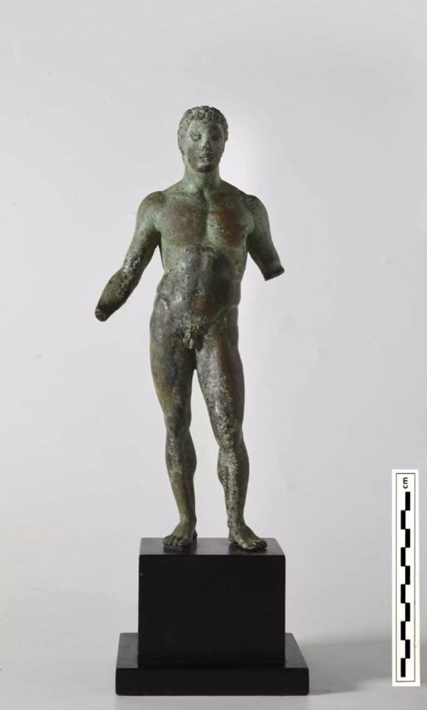 3. Χάλκινο αγαλμάτιο γυμνού νεαρού άνδρα, πιθανόν αθλητή, ύψους 0,24μ. Ο άνδρας παριστάνεται όρθιος, κατενώπιον. Πατά σταθερά στο έδαφος με το δεξί σκέλος. Τα κοντά μαλλιά, ταιριαστά σε αθλητή, αναλύονται σε ακατάστατους βοστρύχους. Θα μπορούσε να χρονολογηθεί στα τέλη του 2ου αι. πΧ.