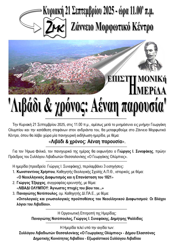 Μνημόσυνο για την 204η επέτειο από το θάνατο του εθνικού ήρωα Γεωργάκη Ολύμπιου θα τελεστεί την ερχόμενη Κυριακή 21 Σεπτεμβρίου στον Μητροπολιτικό Ιερό Ναό Κοιμήσεως της Θεοτόκου στο Λιβάδι Ελασσόνας και θα ακολουθήσει Επιστημονική Ημερίδα με τίτλο «Λιβάδι & χρόνος: Αέναη παρουσία» στο Ζάννειο Μορφωτικό Κέντρο Λιβαδίου.