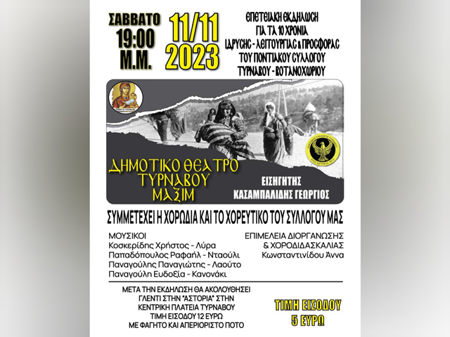 Επετειακή εκδήλωση για τα 10 χρόνια Ίδρυσης – Λειτουργίας και προσφοράς του Ποντιακού Συλλόγου Τυρνάβου – Βοτανοχωρίου το Σάββατο 11 Νοεμβρίου στις 19:00 μ.μ. στο Δημοτικό Θέατρο Τυρνάβου.