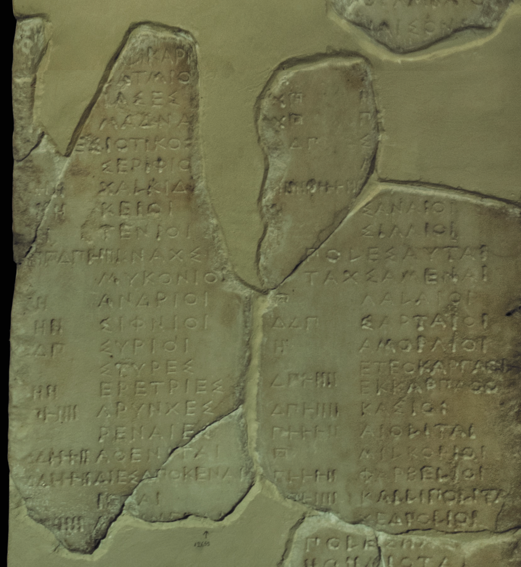 H A΄ Aθηναϊκή ή Δηλιακή Συμμαχία ιδρύθηκε το 478/7 π.Χ. με πρωτοβουλία των Αθηναίων και σκοπό την προστασία των ελληνικών πόλεων από τους Πέρσες. Σημαντικές πληροφορίες για τη συμμαχία παρέχουν οι κατάλογοι “της εξηκοστής του φόρου” των ετών 454/3 π.X. έως 415 π.Χ. Σώζονται τέσσερις μνημειακές στήλες (αίθουσα 1) που είχαν ιδρυθεί στην Ακρόπολη και στις οποίες έχει αναγραφεί το ένα εξηκοστό από τα χρήματα (φόρος), τα οποία οι πόλεις-μέλη κατέβαλλαν για τις ανάγκες και την πολεμική ετοιμότητα της συμμαχίας. Το ποσοστό αυτό δινόταν ως προσφορά στην θεά Aθηνά, προστάτιδα των Αθηναίων.