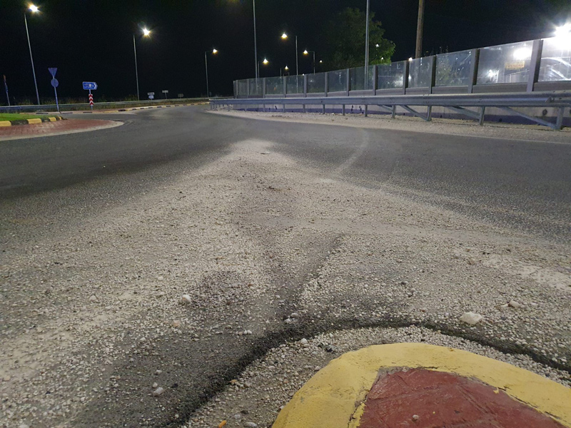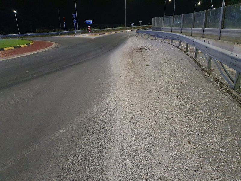 Η παρουσία χαλικιών στη στροφή του κόμβου προκαλεί απώλεια πρόσφυσης στα ελαστικά, γεγονός που μπορεί να οδηγήσει σε σοβαρά τροχαία ατυχήματα. Ο κίνδυνος για οδηγούς και επιβάτες είναι ιδιαίτερα αυξημένος σε περίπτωση που κάποιος δεν προσέξει έγκαιρα τα υλικά στο δρόμο.