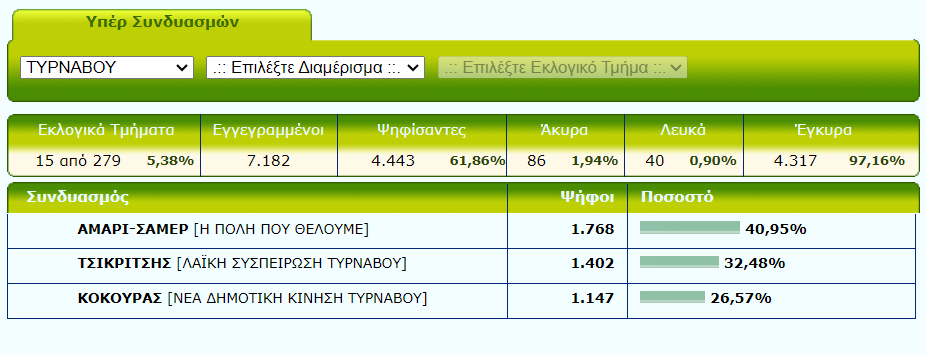Επικράτηση με σημαντική διαφορά για τον Σάμερ Αθανάσιο Αμάρι δείχνουν τα μέχρι τώρα αποτελέσματα για τον Δήμο Τυρνάβου.
