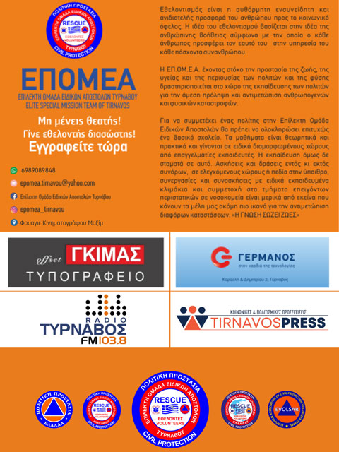 Η ηλεκτρονική εφημερίδα TirnavosPress πάντα κοντά στις εθελοντικές δράσεις ως χορηγός επικοινωνίας. Η ΕΠΟΜΕΑ έχοντας στόχο την προστασία της ανθρώπινης ζωής, της υγείας και της περιουσίας των πολιτών και της φύσης δραστηριοποιείτε στο χώρο της εκπαίδευσης των πολιτών για την άμεση πρόληψη και αντιμετώπιση ανθρωπογενών και φυσικών καταστροφών.