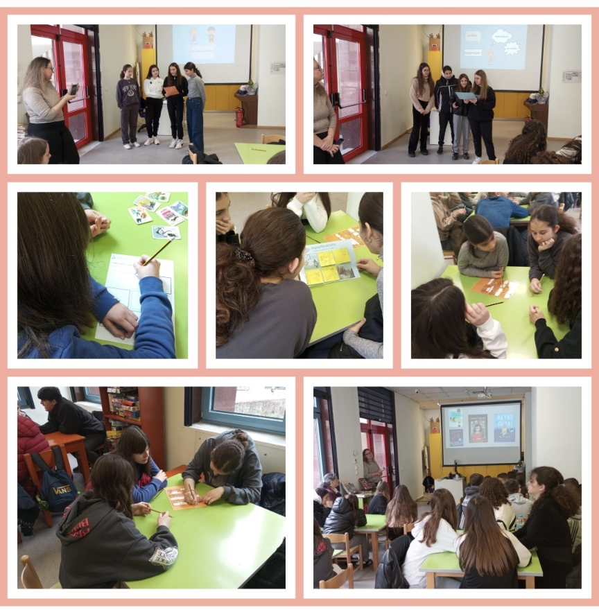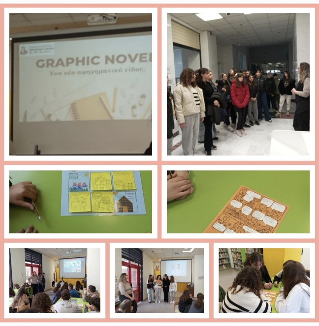 Στη συνέχεια κατευθυνθήκαμε στο τμήμα παιδικών βιβλίων, όπου έγινε προβολή παρουσίασης με θέμα «Graphic novel», ένα νέο είδος αφήγησης με εικόνες, τύπου κόμικ. Οι μαθητές/τριες κατανόησαν τα χαρακτηριστικά του νέου αυτού λογοτεχνικού είδους αφήγησης, την ιστορία του και τον τρόπο δημιουργίας του από τους συγγραφείς, που συνδυάζουν την αφήγηση με τη ζωγραφική και το σκίτσο. Επίσης δόθηκαν στα παιδιά βιβλία της κλασσικής Λογοτεχνίας, που αποδόθηκαν με το νέο αφηγηματικό είδος γραφής Graphic novel , ώστε να τα συγκρίνουν.
