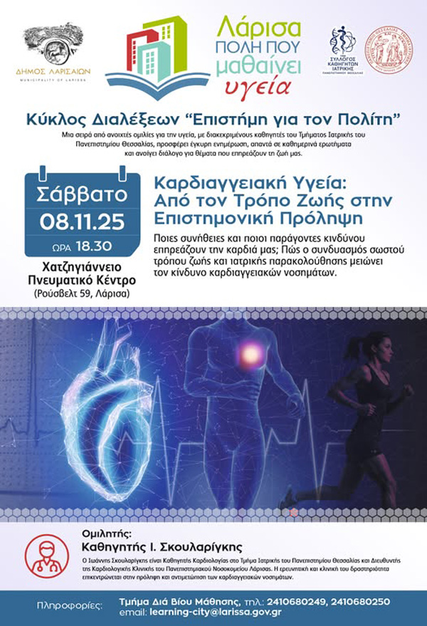 Ο Σύλλογος Καθηγητών του Τμήματος Ιατρικής του Πανεπιστημίου Θεσσαλίας, σε συνεργασία με την Αντιδημαρχία Παιδείας και Άθλησης του Δήμου Λαρισαίων, συνεχίζουν τον επιτυχημένο κύκλο ανοιχτών ομιλιών για την υγεία «Επιστήμη για τον Πολίτη – Ανοιχτές Ομιλίες Υγείας», στο πλαίσιο της δράσης «Λάρισα – Πόλη που Μαθαίνει» και του Πανεπιστημίου των Πολιτών.