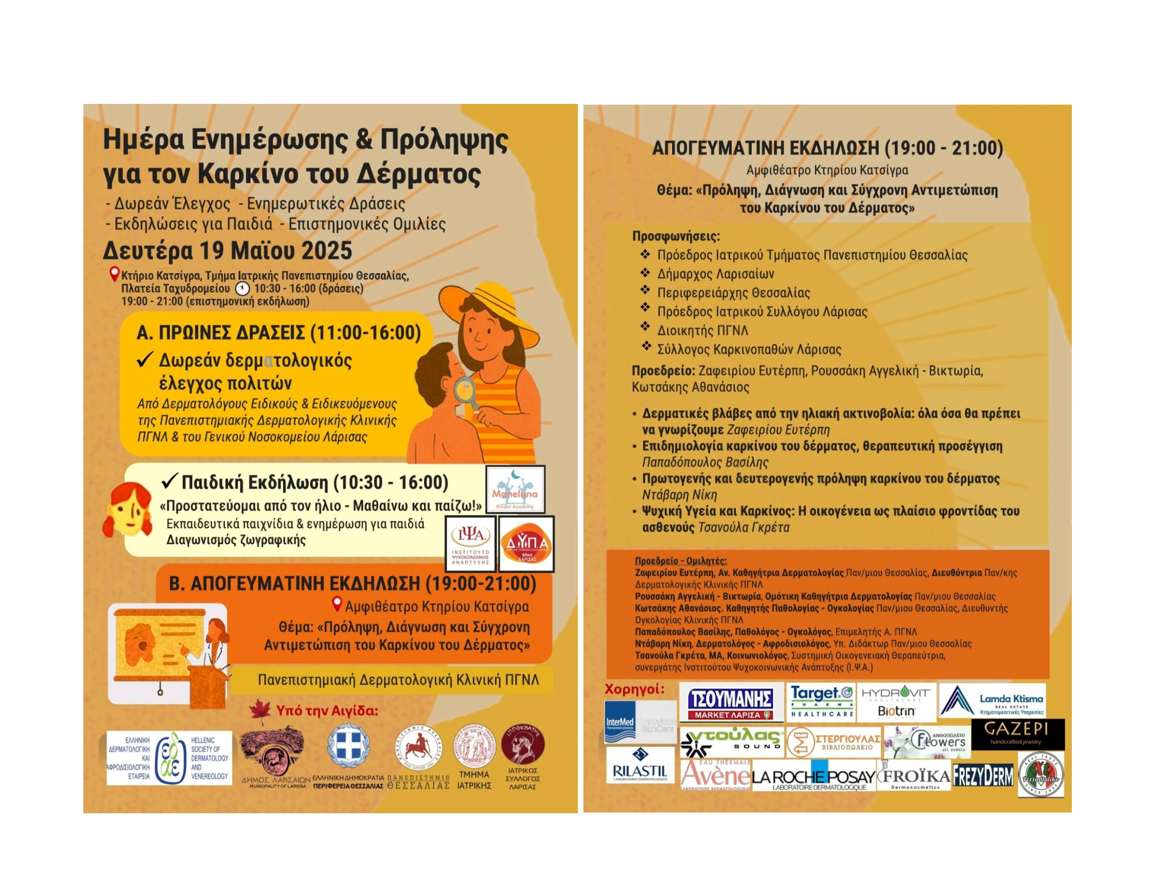 Η Πανεπιστημιακή Δερματολογική Κλινική του Πανεπιστημιακού Γενικού Νοσοκομείου Λάρισας, στο πλαίσιο της πανελλαδικής εκστρατείας ενημέρωσης και πρόληψης για τον καρκίνο του δέρματος της ΕΔΑΕ, σας προσκαλεί στην εκδήλωση: