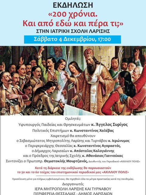Το Σάββατο 4 Δεκεμβρίου 2021, στις 5.00 το απόγευμα, θα πραγματοποιηθεί στην Ιατρική Σχολή Λαρίσης (αίθουσα Ιπποκράτης) Επιστημονική Εσπερίδα, με θέμα: «200 χρόνια. Και από εδώ και πέρα τι;».