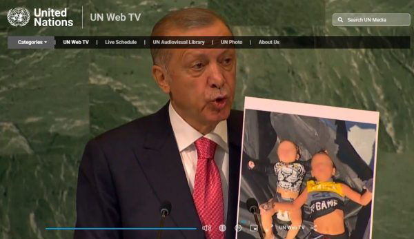 Εφ’ όλης της ύλης επίθεση κατά της Ελλάδας εξαπέλυσε ο τούρκος πρόεδρος από τη βήμα του ΟΗΕ – Παρουσίασε φωτογραφία προσφυγόπουλου το οποίο βρήκε τραγικό θάνατο