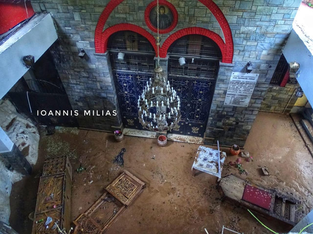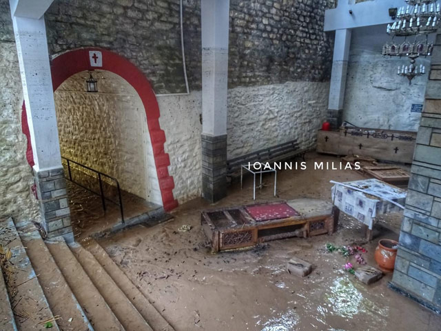 Για πρώτη φορά στα 60 χρόνια που η γέφυρα βρίσκεται εκεί το νερό έφτασε τόσο ψηλά, κατέστρεψε την γέφυρα ενώ στο εσωτερικό της εκκλησίας που χιλιάδες πιστοί έχουν ανάψει ένα κερί τα πάντα είναι διαφορετικά.