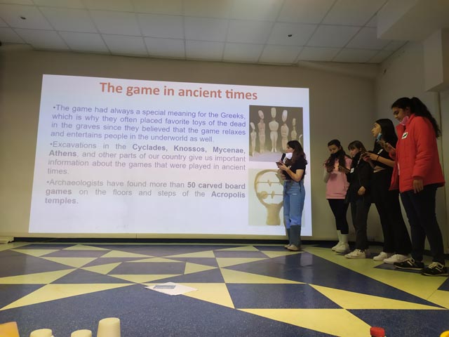 Στο 2ο μέρος παρουσιάσαμε και αναβιώσαμε παιχνίδια στρατηγικής και όξυνσης του νου από την Αρχαία Ελλάδα. Το νέο μας παιχνίδι παρόμοιο με την “Πεττία”, που έπαιζε ο Αχιλλέας με τον φίλο του Αίαντα με μικρές διαφοροποιήσεις, που το ονομάσαμε “Line Drawing” εντυπωσίασε τους εταίρους μας. Συνεχίσαμε με μια εξαιρετική δραστηριότητα με παιχνίδια ποίησης σε όλες τις γλώσσες των συμμετεχόντων χώρων .H μέρα τελείωσε με ένα υπέροχο γεύμα με άρωμα Ιταλίας και χορό.