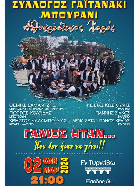 Το Σάββατο 02.03.2024 ο Σύλλογος Γαϊτανάκι Μπουρανί Τυρνάβου διασκεδάζει με πολλά πειράγματα στο café Εν Τυρνάβω με τους Γιάννη Ζιάκο, Λένα Ζέττα, Πάνο Κραία, Κώστα Κωστούλη, Χρήστο Καλαμπούκα και Θέμη Σαμαντζή. Κέφι, χορός, τραγούδι, στις 10:00μμ.
