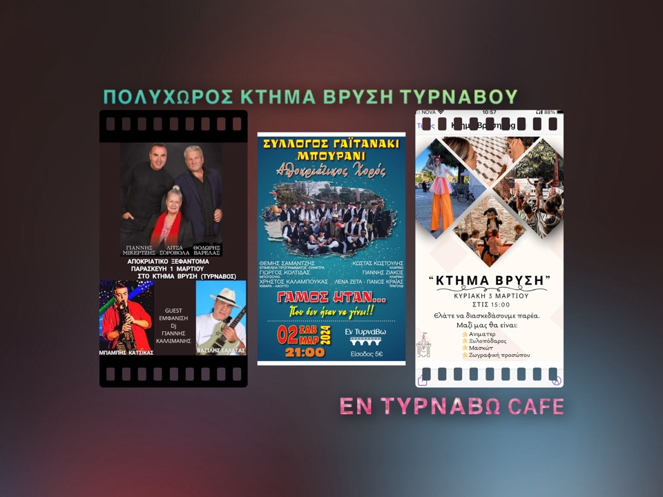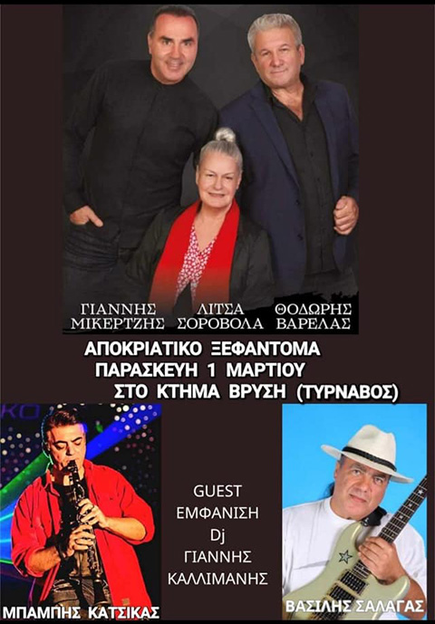 Παρασκευή 01.03.2024: Γυρνάμε το χρόνο πίσω με μουσικά ονόματα «όπως παλιά» και υποδεχόμαστε τους Θοδωρή Βαρελά, Γιάννη Μικερτζή και Λίτσα Σοροβόλα. Τους προϋπαντεί ο γνωστός dj Καλλιμάνης με τα φαντασμαγορικά εφέ του στο Κτήμα Βρύση Τυρνάβου, στις 11:00μμ. Τα έσοδα της κάρτας εισόδου θα δοθούν ως χορηγία για την ενίσχυση του Τυρναβίτικου Καρναβαλιού.