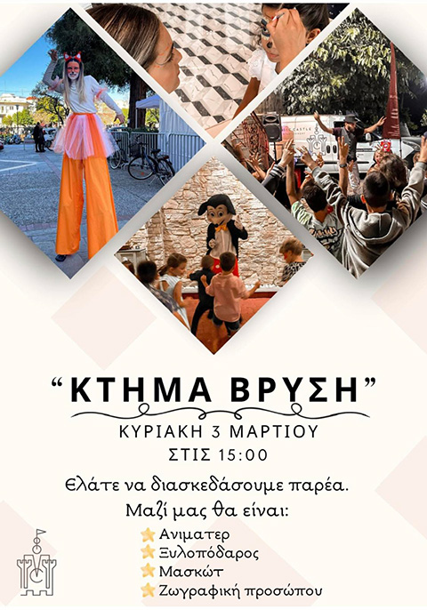 Την Κυριακή 03.03.2024 ελάτε στο Κτήμα Βρύση για ένα διαδραστικό πρόγραμμα για τους μικρούς μας φίλους με κλόουν, μαγικά, ξυλοπόδαρους και face painting. Πολλά παιχνίδια και διαγωνισμοί, στις 3:00μμ.